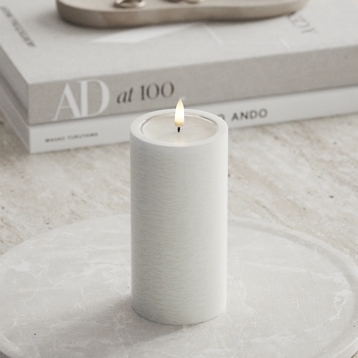 Skapa en magisk atmosfär med detta eleganta LED-blockljus från UNIQUE Candles. Med sin handgjorda, strukturerade yta och en förstärkt topp i harts erbjuder detta ljus en lyxig och verklighetstrogen look. Tack vare den patenterade 3D REAL FLAME™-teknologin får ljuset en imponerande lågeffekt som skapar en varm och inbjudande stämning. Detta ljus är både säkert och hållbart, perfekt för användning inomhus eller utomhus. Ljusets timerfunktion kan enkelt kontrolleras med en fjärrkontroll (säljs separat), vilket ger extra bekvämlighet i din vardag.