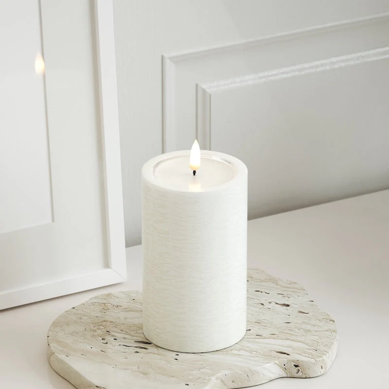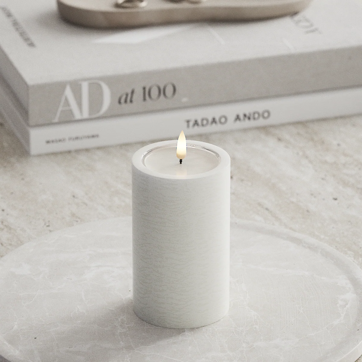 Skapa en elegant atmosfär i ditt hem med detta lyxiga LED-blockljus från UNIQUE Candles. Med en stilren och exklusiv design är detta handgjorda ljus tillverkat med en unik strukturerad yta som ger en känsla av äkta stearinljus. Den förstärkta toppen i harts ger en WETLOOK™-design, och med den patenterade 3D REAL FLAME™-teknologin får du en fantastisk och realistisk lågeffekt. Detta LED-ljus är både säkert och hållbart. Du kan styra ljuset med en fjärrkontroll (säljs separat), som också erbjuder en praktisk timerfunktion för att enkelt kunna skapa stämning i ditt hem. Hela UNIQUE-kollektionen kommer vackert förpackad i eleganta presentlådor, vilket gör dem till en perfekt gåva eller inredningsdetalj.